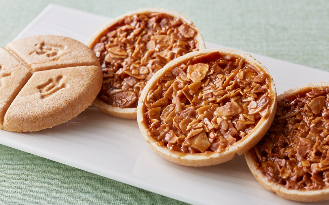 最中種の中にアーモンドの刻み入り、キャラメル生地を流して焼き上げました。どなたにもおすすめしたい新食感です。