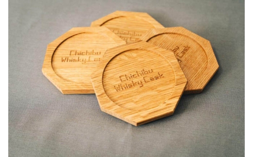 秩父市のウイスキー蒸溜所で実際に熟成に使われた樽から作られたコースター4枚セットです。 八角形は『繁栄』『幸運』『幸福』など縁起の良い形とされています。コーヒーカップを置いたりインテリアとして飾ったり使い方は様々です。 『Chichibu Whisky Cask』レーザー加工入り 本返礼品は、自社工場にて製作(原材料の仕入れ・選別・洗浄・カット・加工・塗装・梱包)出荷までの全ての工程を秩父市内にて行っております。