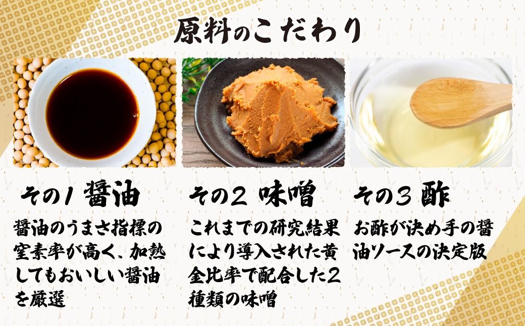 醤油のうまさ指標の窒素率が高く、加熱してもおいしい醤油を厳選、これまでの研究結果により導入された黄金比率で配合した2種類の味噌と、お酢が決め手の醤油ソースの決定版です!