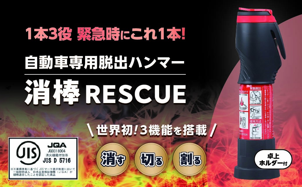 窓ガラス粉砕機能・シートベルト切断機能・CO2消火具を装備した緊急脱出ツール 卓上ホルダー付き消棒RESCUE YPS-008 | シートベルトカッター ハンマー 自動車用品 サイドガラス 脱出ツール 緊急ツール 車用 安全ハンマー 緊急 防災 非常用 水害 地震 津波 台風 脱出 救出 救助 支援 支援用具 支援ツール 日本製 正規品 多機能 消防 消防RESCUE 消防レスキュー 消棒レスキュー 埼玉県 所沢市