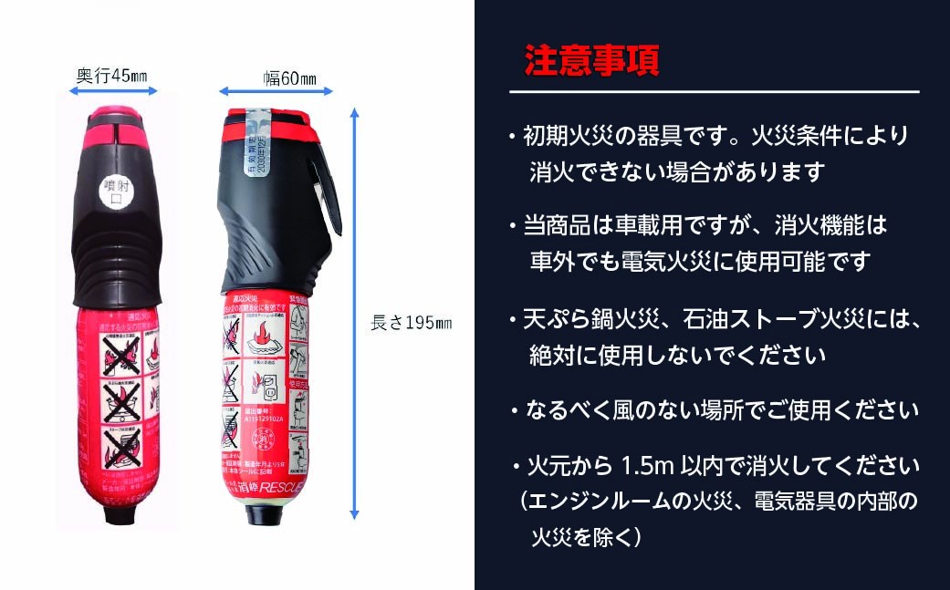 ・当商品は車載用ですが、消火機能は車外でもクッション火災や電気火災に使用可能です。