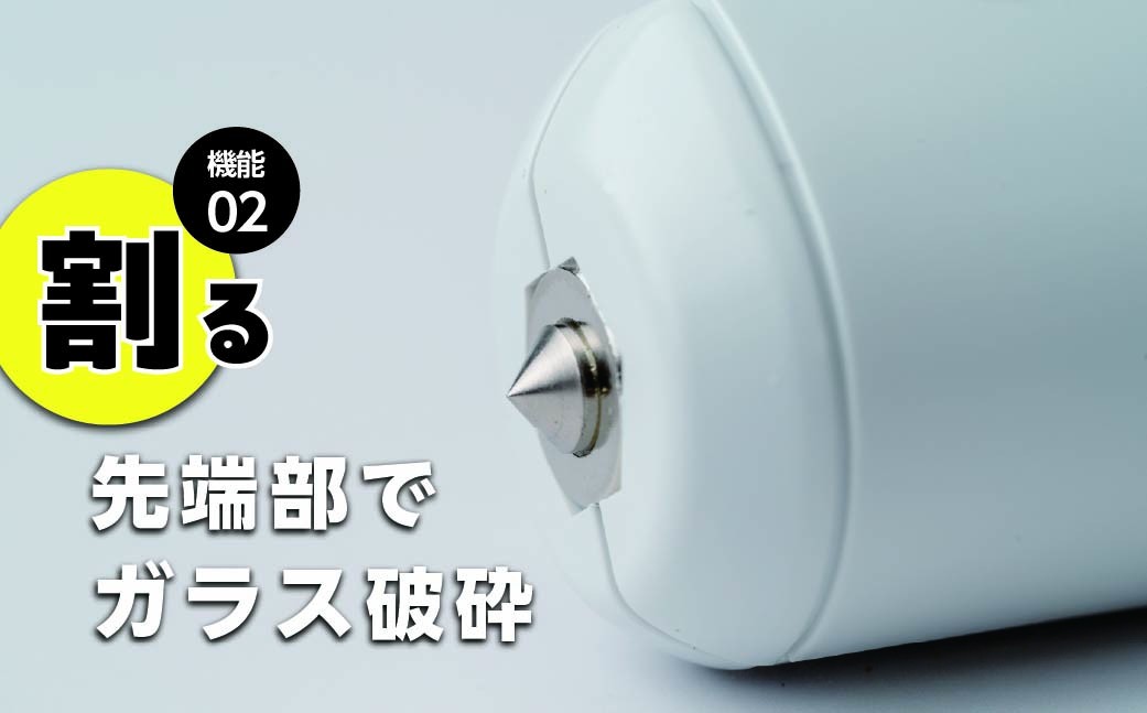 | 容量 | 自動車用緊急脱出支援用具 (シートベルト切断機能、窓ガラス破砕機能) ドアポケットに装着できる車載用アタッチメント付き ■サイズ 幅30mm×奥行35mm×長さ160mm ■重量 約145g ■材質 ABS樹脂 |