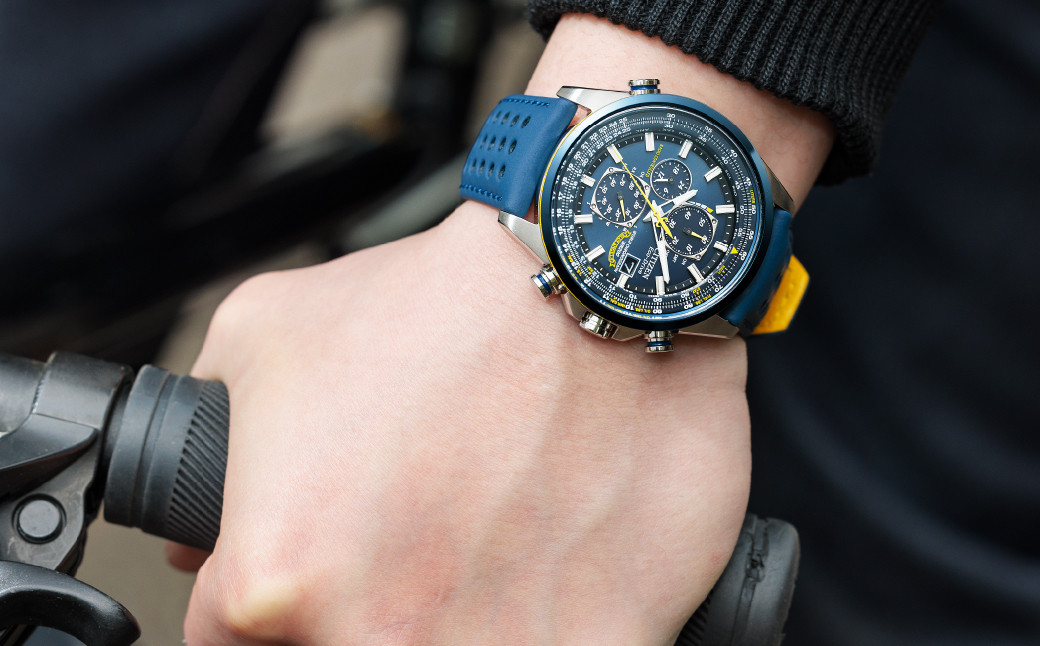 ブルーとイエローの機影を映した多彩な高機能パイロットウォッチ。