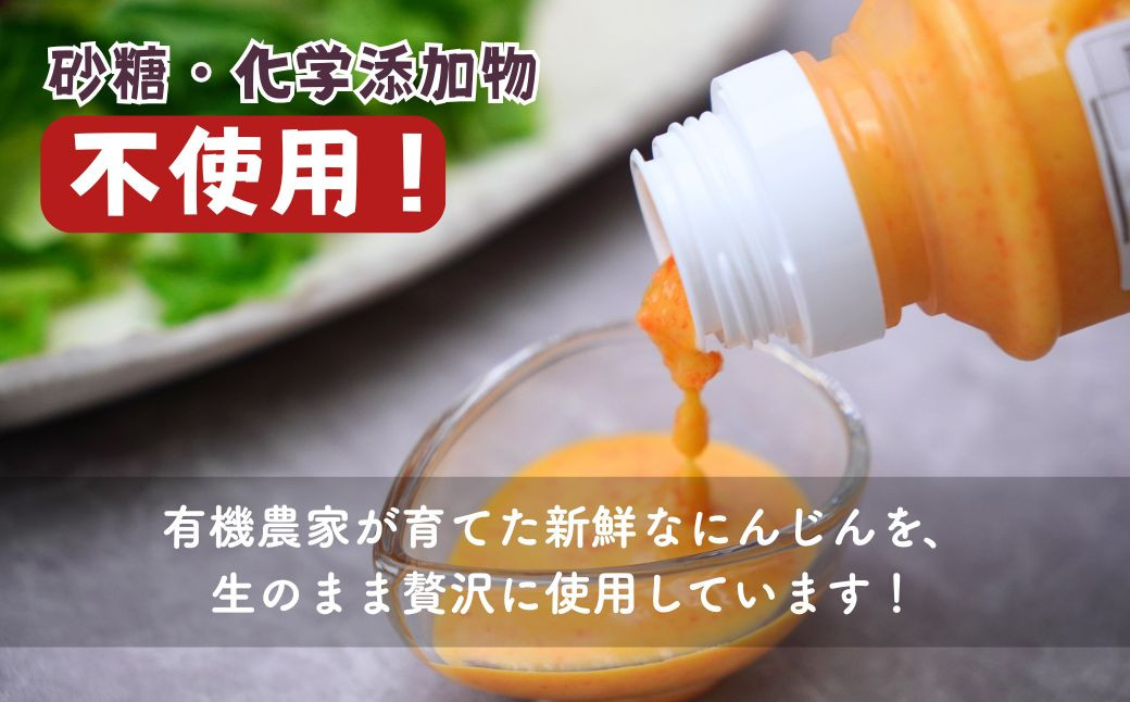 有機農家自慢のにんじんをプロの料理人が砂糖や化学添加物を使用せずに作りあげたこだわりのドレッシングです。