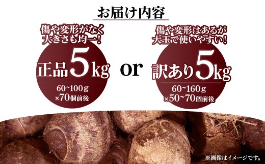 容量 | 鈴宗園の里芋 5kg ▼お好きな種類をお選びいただけます。 ・正品(70個前後):贈答用や高級料亭でも使われる。傷や変形のない大きさの揃っている里芋。 ・訳あり品(50~70個):傷や変形はあるものの大玉で家庭用には使いやすいお得な里芋。 |