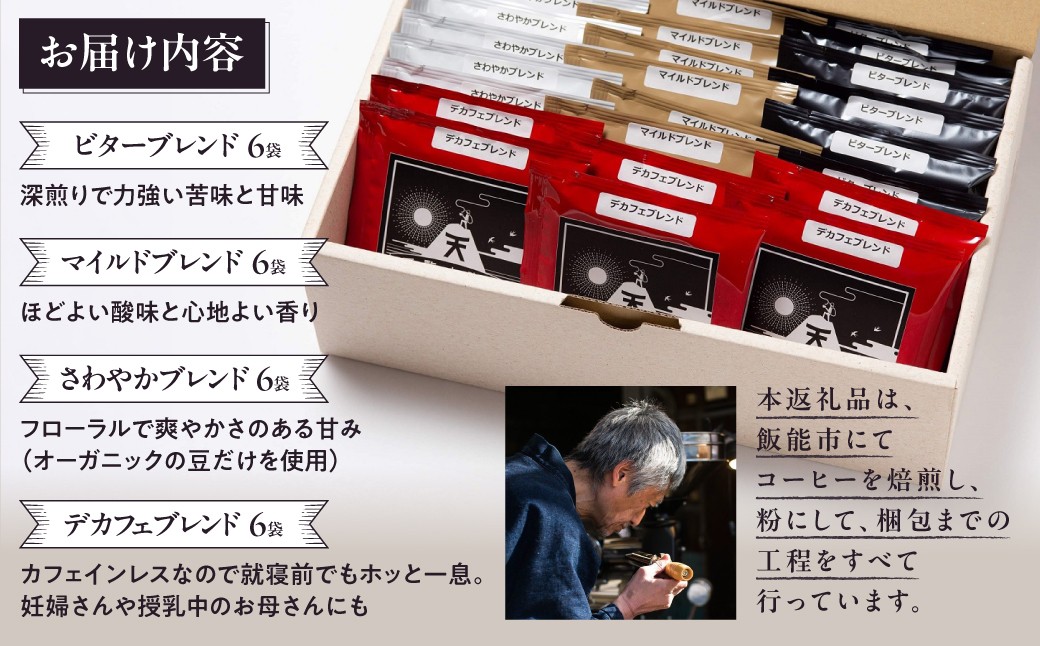 | 容量 | ビターブレンド 6袋 マイルドブレンド 6袋 さわやかブレンド 6袋 デカフェブレンド 6袋 (各袋に挽いた珈琲豆10g) |