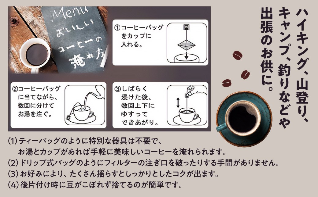 (1)ティーバッグのように特別な器具は不要で、お湯とカップがあれば手軽に美味しいコーヒーを淹れられます。