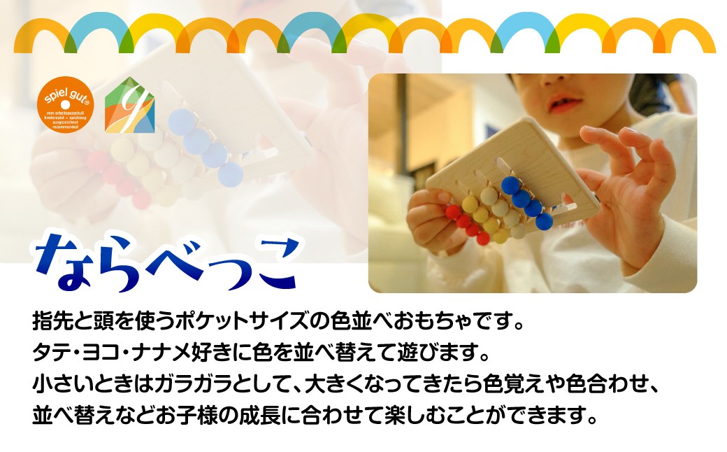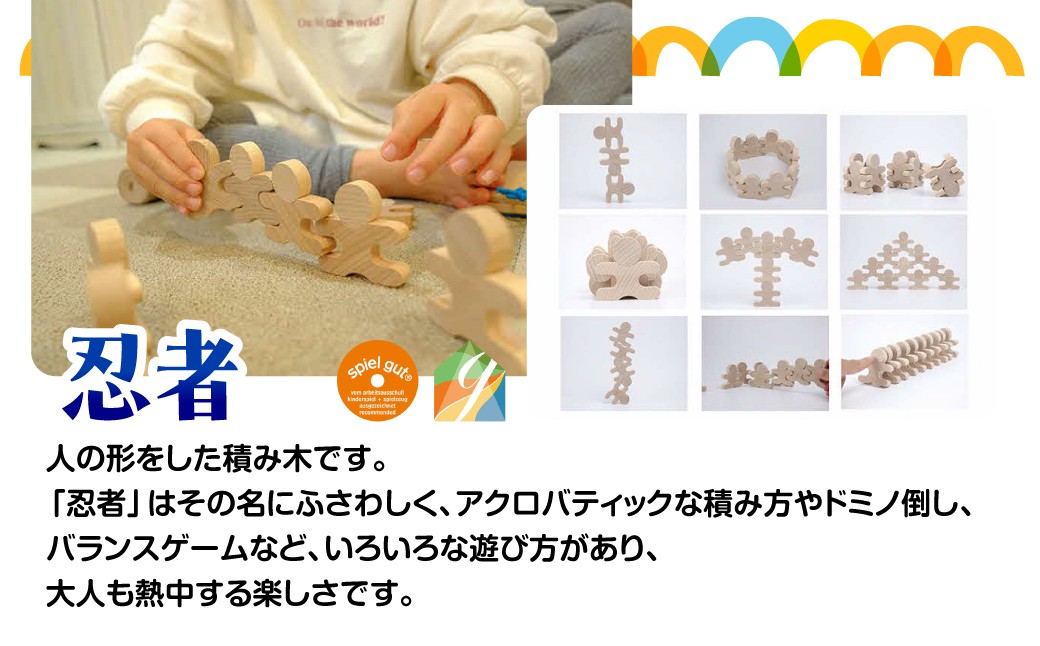 「ならべっこ」と「忍者」はヨーロッパ玩具ではお馴染みのspiel gut(シュピールグート)と日本のGOOD TOY(グットトイ)にも認定されており、国内外問わず人気の木のおもちゃです。