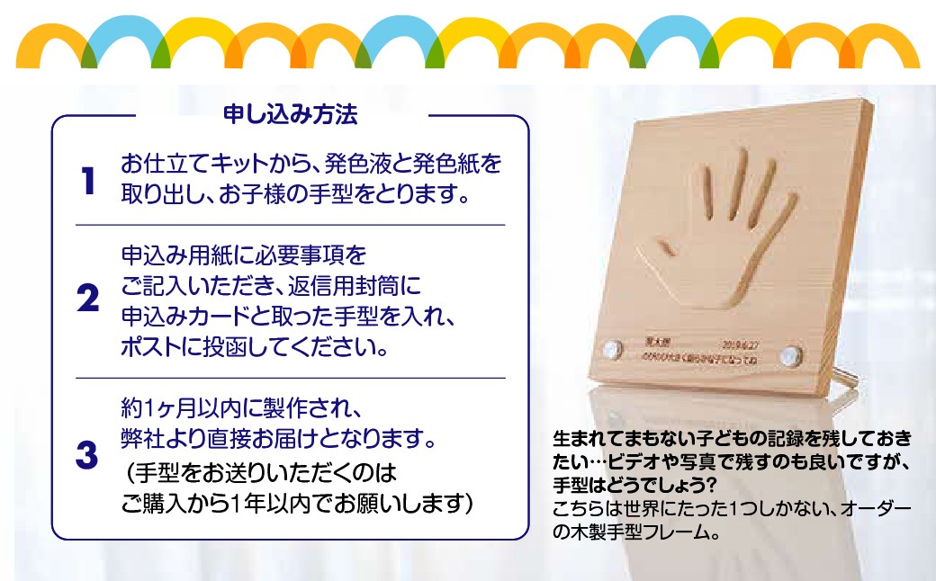 ②申込み用紙に必要事項をご記入いただき、返信用封筒に申込みカードと取った手型を入れ、ポストに投函してください。