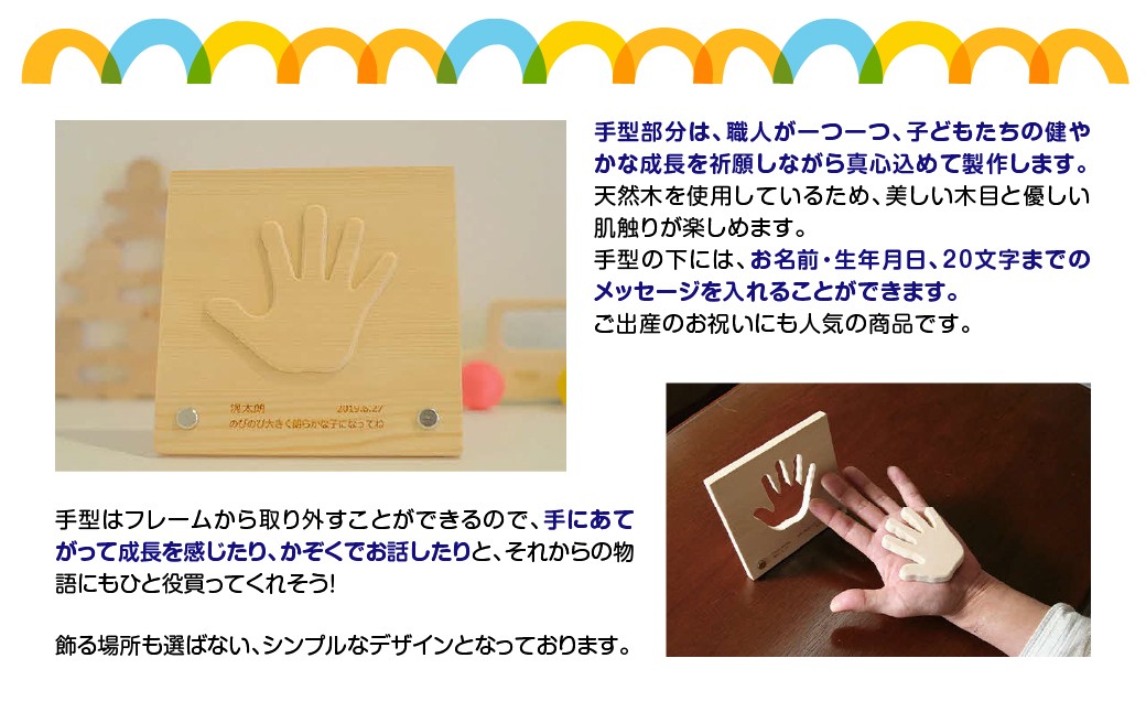 手型はフレームから取り外すことができるので、手にあてがって成長を感じたり、かぞくでお話したりと、それからの物語にもひと役買ってくれそう!飾る場所も選ばない、シンプルなデザインとなっております。