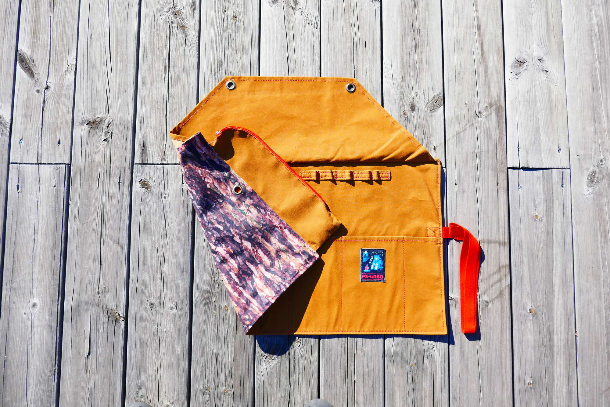 樹脂迷彩柄(スギカモ)アウトドアグッズで、大小9つのポケットを搭載。巻くと西川材の薪のようなフォルムに変身します。