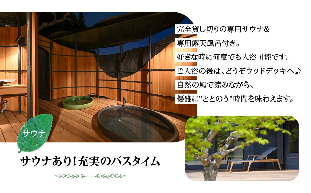 完全貸し切りの専用サウナ&専用露天風呂付き。好きな時に何度でも入浴可能です。ご入浴の後は、どうぞウッドデッキへ♪自然の風で涼みながら、優雅に"ととのう”時間を味わえます。