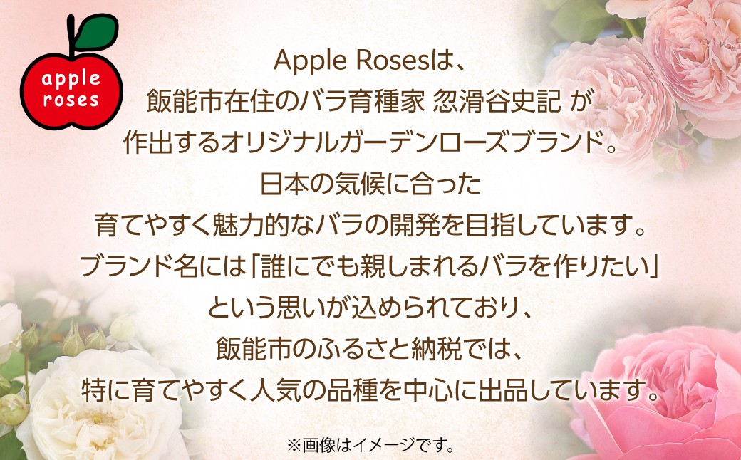 『Apple Roses』のブランド名には、「誰にでも親しまれるようなバラを作りたい」という意味を込めています。