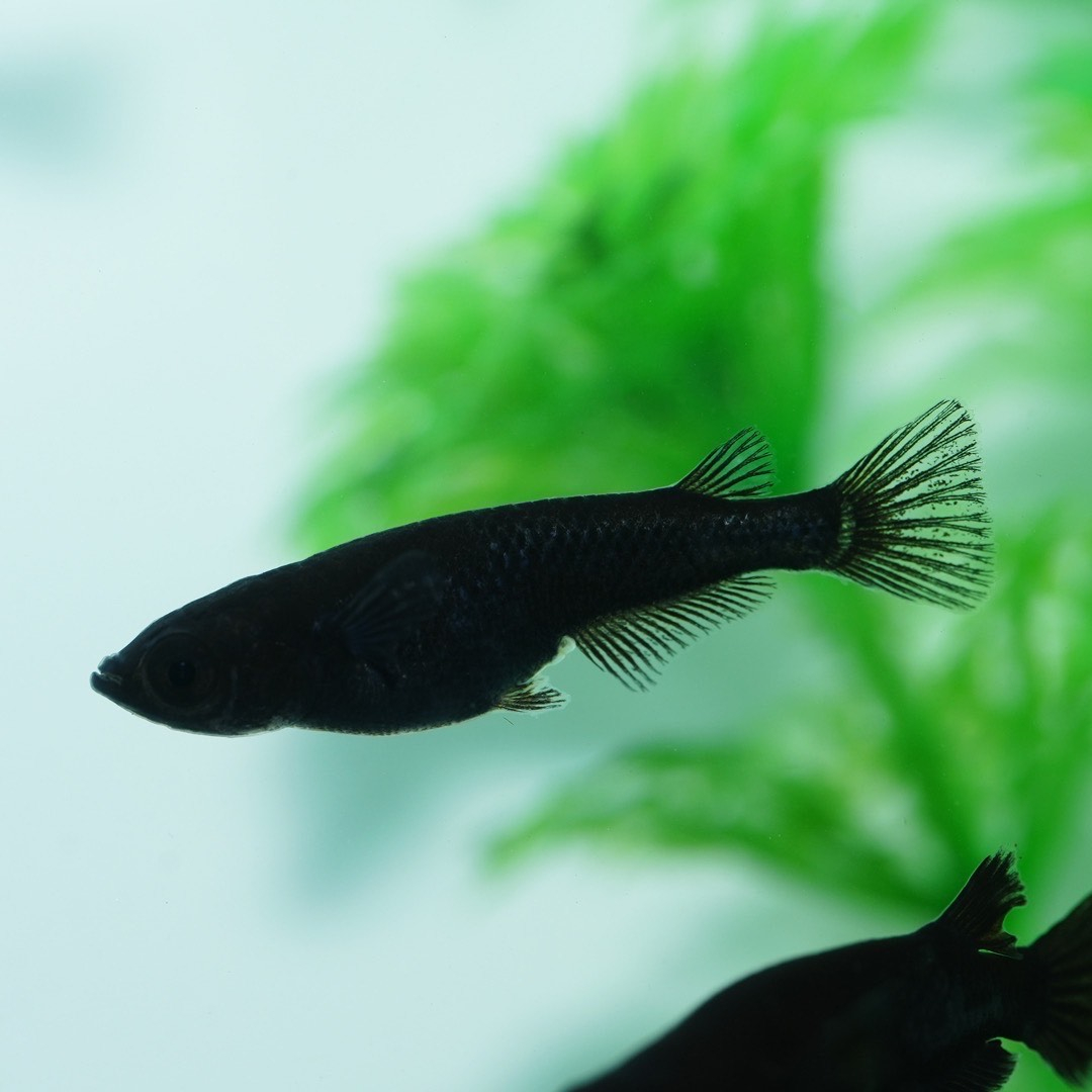 目、ヒレ、腹部も黒く全身真っ黒な体色がかっこいいメダカです。また背地反応しないため白容器でも真っ黒なままで飼育、観賞が楽しめます。