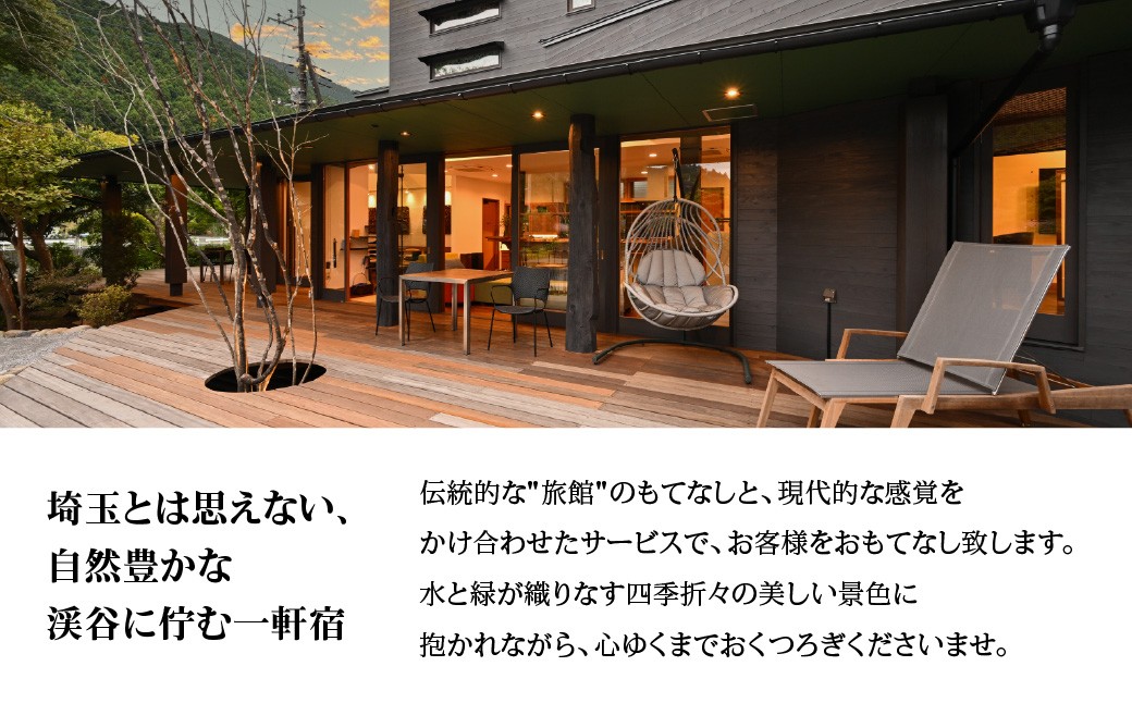 名栗温泉大松閣は、「新宿駅から電車又は車で2時間圏内」の近場ながら、自然豊かな渓谷に佇む一軒宿。伝統的な"旅館"のもてなしと、現代的な感覚をかけ合わせたサービスで、お客様をおもてなし致します。