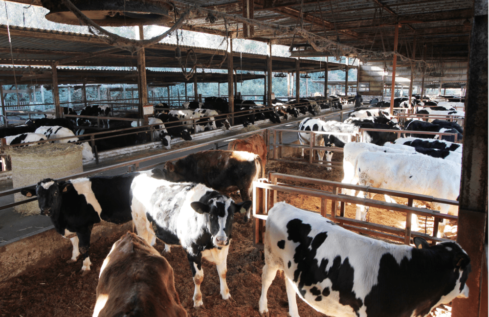 国分牧場の牛舎は、広々ゆったり。効率よりも牛にストレスを感じさせない「アニマルウェルフェア」の考え方を大切に、飼育を行っています。毎朝、1頭1頭の健康状態を見てから念入りに掃除。たっぷりの餌を与え、床には定期的に県産材などから挽いたおが屑を敷きます。また、牛は暑さに弱いため、牛舎周辺に木を植えて木陰を作り、大きな換気扇で風を送るなどの工夫をしています。