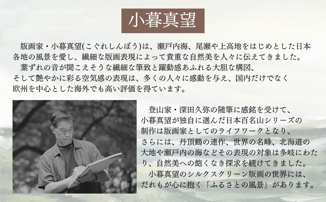 「合掌の灯」 小川手漉和紙使用 2022年 制作 リミッテッド・エディッション 280 スケッチ場所:岐阜県 白川村 版画家・小暮真望(こぐれしんぼう)は、瀬戸内海、尾瀬や上高地をはじめとした日本各地の風景を愛し、繊細な版画表現によって貴重な自然美を人々に伝えてきました。 葉ずれの音が聞こえそうな繊細な筆致と躍動感あふれる大胆な構図、そして艶やかに彩る空気感の表現は、多くの人々に感動を与え、国内だけでなく欧州を中心とした海外でも高い評価を得ています。 登山家・深田久弥の随筆に感銘を受けて、小暮真望が独自に選んだ日本百名山シリーズの制作は版画家としてのライフワークとなり、さらには、丹頂鶴の連作、世界の名峰、北海道の大地や瀬戸内の海などその表現の対象は多岐にわたり、自然美への飽くなき探求を続けてきました。 小暮真望のシルクスクリーン版画の世界には、だれもが心に抱く「ふるさとの風景」があります。 【地場産品に該当する理由】3号/製品の主要な製造・加工を市内で行っており、相応の付加価値が生じているものであるため