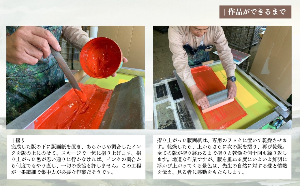 摺り上がった版画紙は、専用のラックに置いて乾燥させます。乾燥したら、上からさらに次の版を摺り、再び乾燥。全ての版が摺り終わるまで摺りと乾燥を何十回も繰り返します。地道な作業ですが、版を重ねる度にいよいよ鮮明に浮かび上がってくる景色は、先生の自然に対する愛と情熱を伝え、見る者に感動をもたらします。