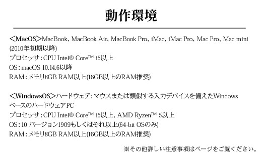 容量 | <動作環境> ・Windows11/10 (64ビット版) バージョン21H2以降、macOS Sonoma (v14.0)、macOS Ventura (v13.0)、macOS Monterey (v12.0) (最新リビジョン) 【Windows】 ・プロセッサ:CPU Intel® Core™ i5以上、AMD Ryzen™ 5以上 ・OS:10バージョン1909もしくはそれ以上 (64-bitOSのみ) ・RAM:メモリ8GBRAM以上 ・ディスクの空き容量:ハードウェアディスク10GBの空き容量 ・ディスプレイ:1280×768サイズ以上 ・グラフィックス:OpenGL 3.3以降対応のグラフィックカード ※インターネット接続必須 【Mac】 ・プロセッサ:CPU Intel® Core™ i5以上 ・OS:macOS 10.14.6以降 ・RAM:メモリ8GB RAM以上 ・ディスクの空き容量:ハードウェアディスク10GBの空き容量 ・ディスプレイ:1280×768サイズ以上 ※インターネット接続必須 |