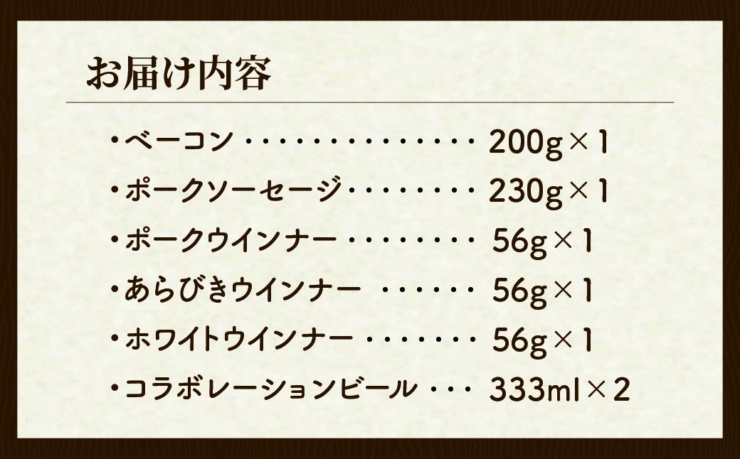 | 容量 | ・ベーコン 200g×1 ・ポークソーセージ 230g×1 ・ポークウインナー 56g×1 ・あらびきウインナー 56g×1 ・ホワイトウインナー 56g×1 ・サイボク×コエド コラボレーションビール 333ml×2 |