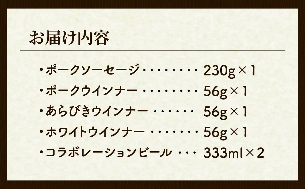 | 容量 | ・ポークソーセージ 230g ・ポークウインナー 56g ・あらびきウインナー 56g ・ホワイトウインナー 56g ・サイボク×コエド コラボレーションビール 333ml×2 |