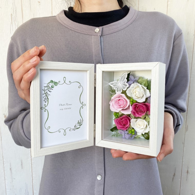 豪華で上品なフォトフレームアレンジで、お祝い、インテリア、ギフト、母の日にもおすすめです。