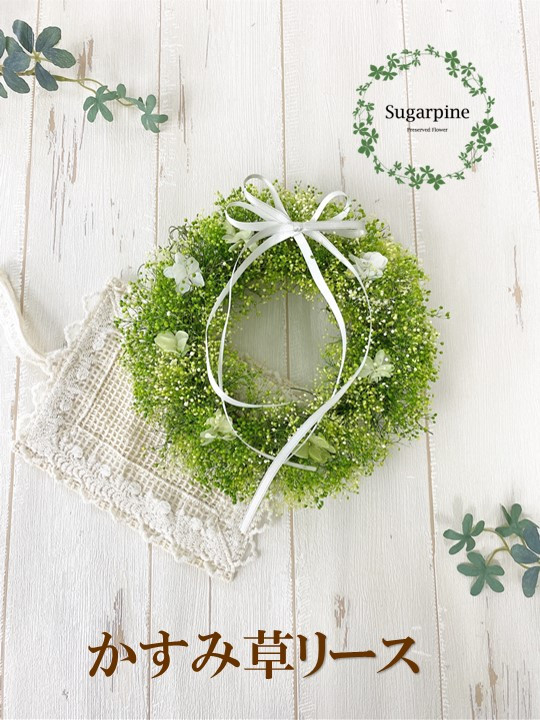 カスミ草をふんだんに使用したリースです。インテリア、ギフト、母の日にもおすすめです。 シュガーパインの製品は造花を一切使用せず、高品質のプリザーブドフラワーとドライフラワーのみを使用しています。