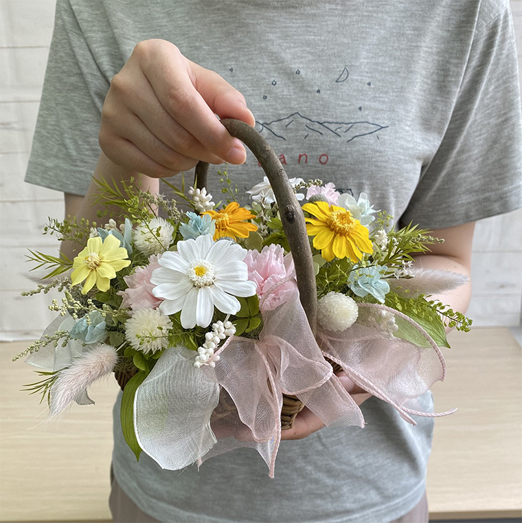 カラフルでナチュラルなバスケットアレンジに オーガンジーのリボンをあしらい、 より華やかに仕上げました。