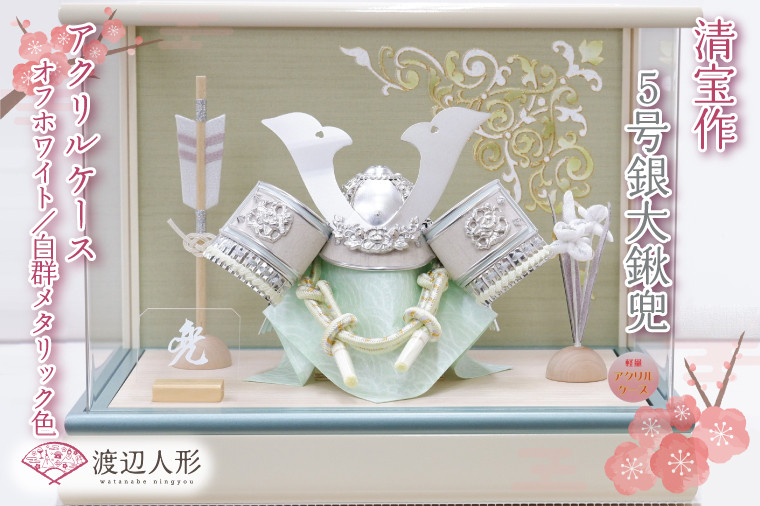 BL026-1 清宝作兜ケース飾り 5号銀大鍬兜 アクリルケース オフホワイト/白群メタリック色(AK6-5)