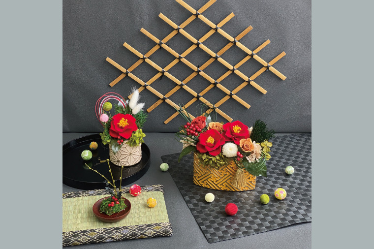 フラワーアレンジのデザイン、花材のアレンジ、接着、包装