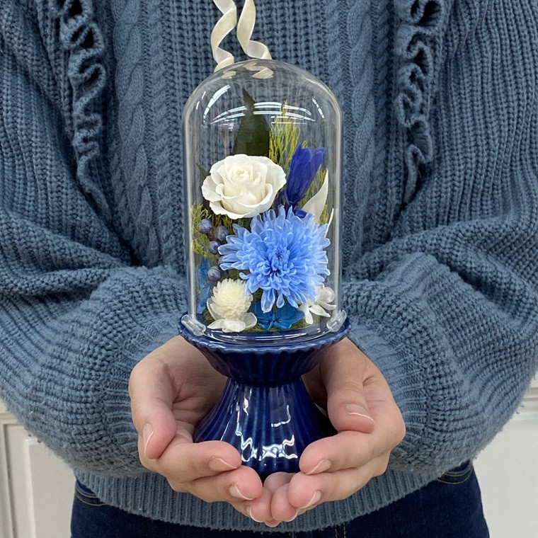 藍色の陶器製花器に白と青を基調とし、珍しいリンドウを使用した、上品なガラスドーム付きの仏花です。