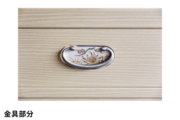引き出しの組み手や細部に至るまで手間暇をかけ、技術、材料全てに拘って、春日部で唯一の桐簞笥製作工房の伝統工芸士が作りあげた、「伝統的工芸品指定商品」の春日部桐簞笥です。