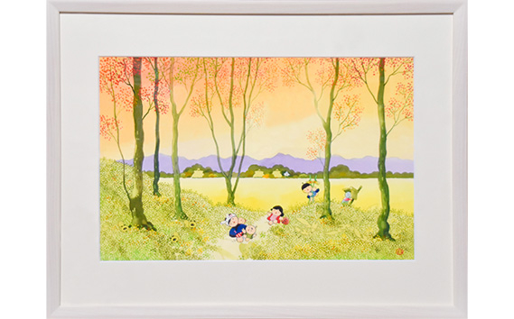 “武蔵野の雑木林シリーズ”をテーマとし、武蔵野の四季の風景の中でたわむれる童(わらべ)と動・植物がいる、なつかしい日本の原風景を求めて、雑木林を散策し、いつまでも残しておきたい心のふるさとを描いています。