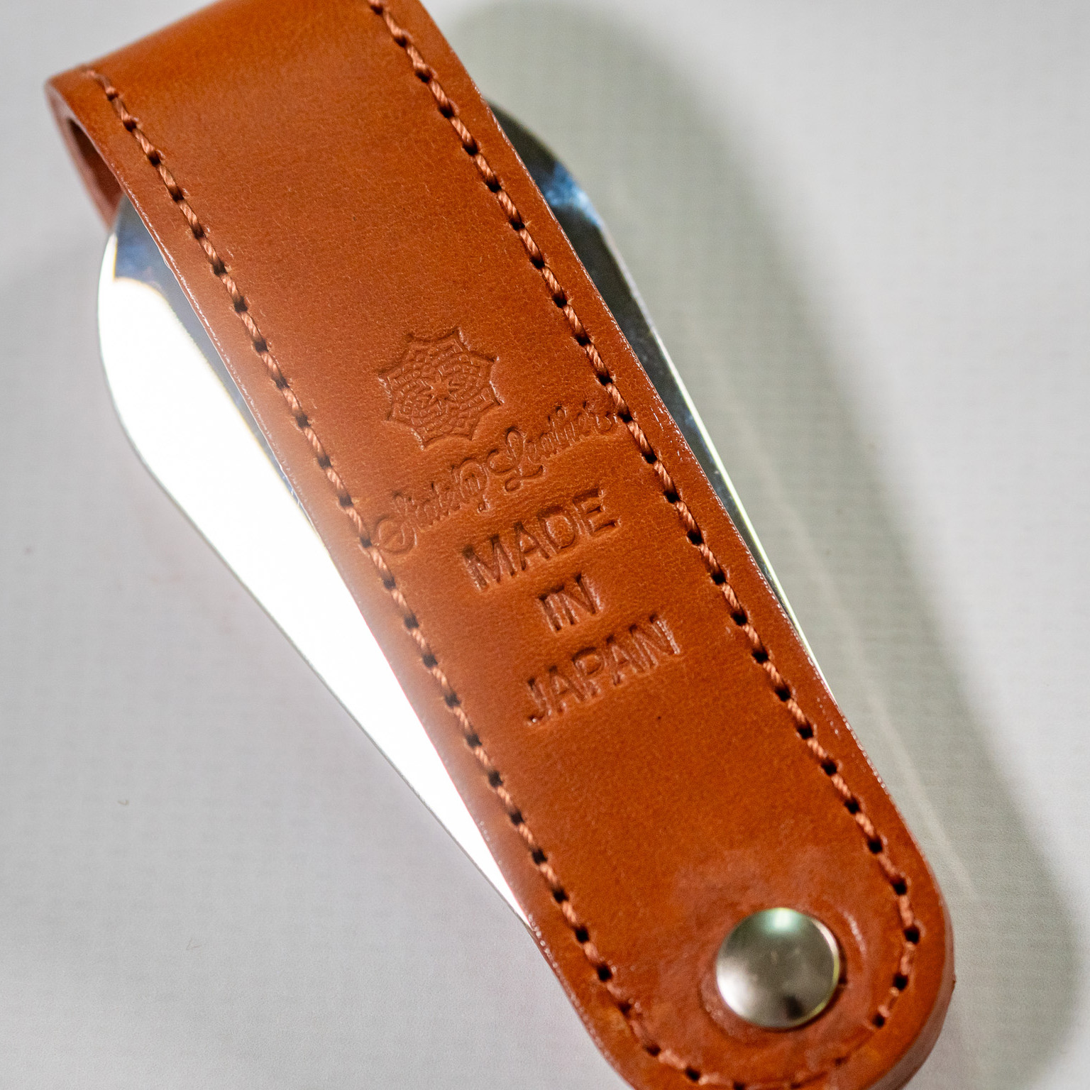 金属を金型プレスで抜きクセ付けをして、牛革と合わせて仕上げた携帯用の高級レザーシューホーン。