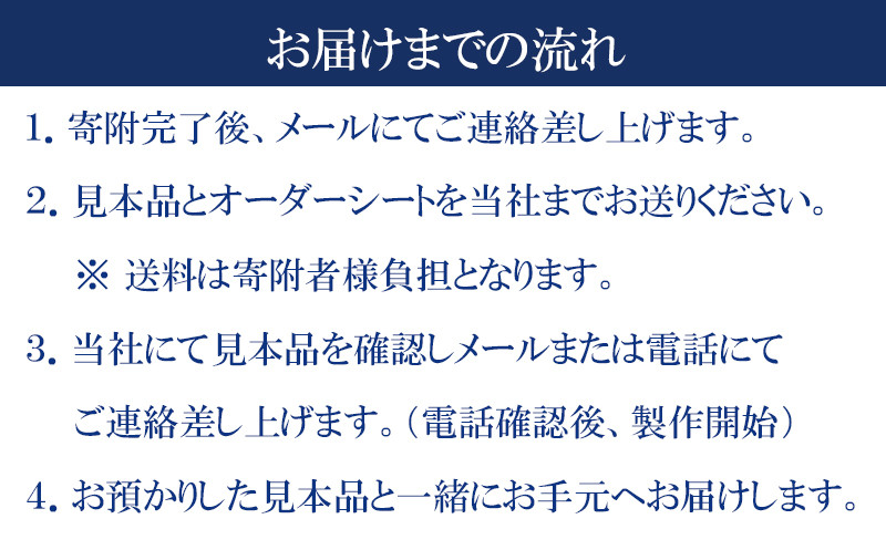 連絡を受けた後、オーダーシートをダウンロード、プリントアウトし、必要事項をご記入のうえ、見本品と一緒に当社までお送りください。