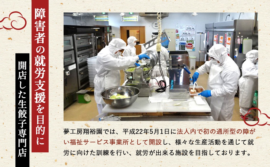 餃子づくりには障がい者の方も携わっており、餃子をお召し上がりいただくことで就労支援にもご協力いただけます!