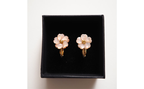幅12mmの美しいピンクシェルで作られた繊細な彫刻が施されたお花を、調節可能なネジバネ式のイヤリングに仕立てました。