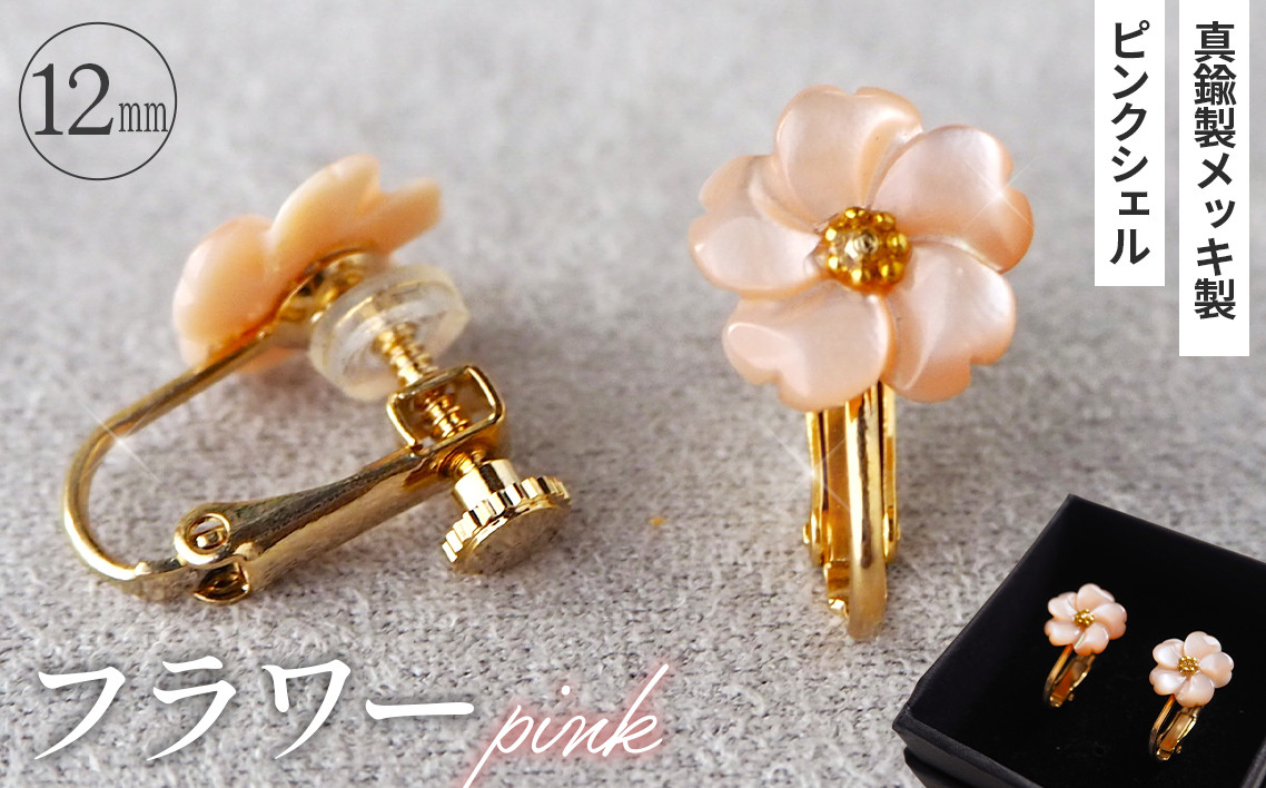 シェルのイヤリング フラワー[ピンク] 金属アレルギー対応 真鍮製メッキ製(シリコンカバー付き) ネジバネ式イヤリング ハンドメイド No.042-05