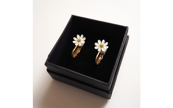 幅10mmの美しいシェルで作られた繊細な彫刻が施されたマーガレットを、調節可能なネジバネ式のイヤリングに仕立てました。