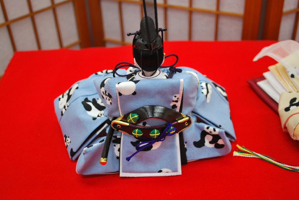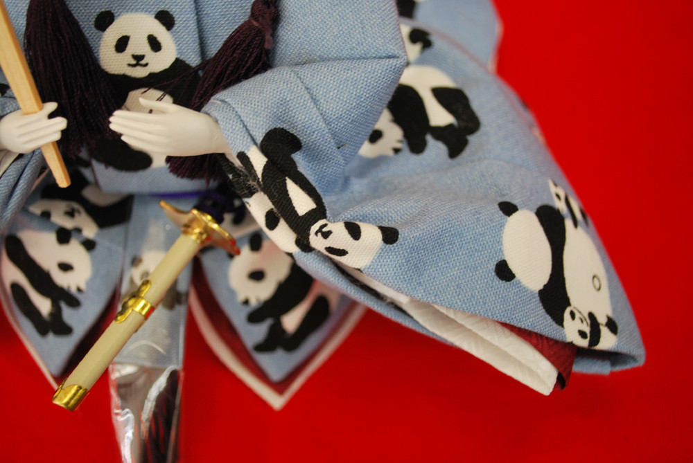親子パンダの生地を使用して鴻巣の職人が手掛けた、非常に特徴的な雛人形です。
