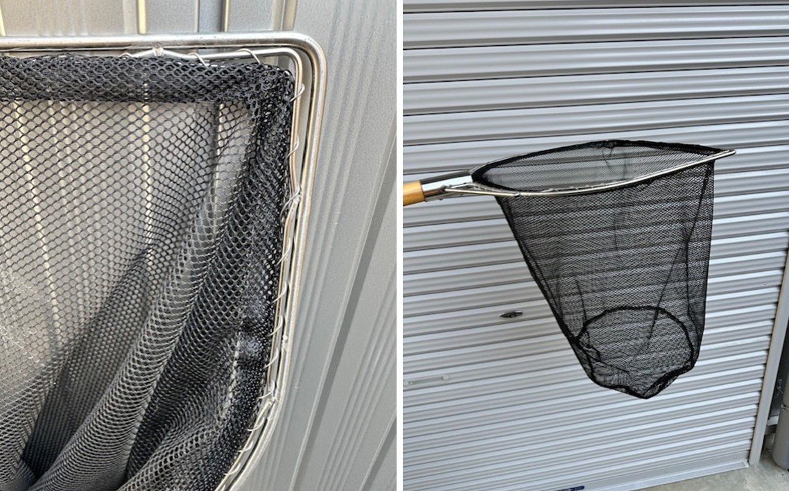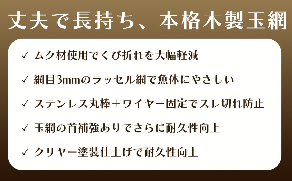 網目3mm、魚体にやさしいラッセル網使用、本格的木製柄ネットは内側の3mmステン丸棒にステンレスワイヤーで固定してあり、網のスレ切れを防止しております。