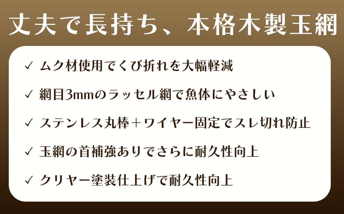 網目3mm、魚体にやさしいラッセル網使用、本格的木製柄ネットは内側の3mmステン丸棒にステンレスワイヤーで固定してあり、網のスレ切れを防止しております。