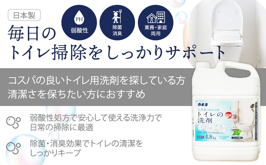 毎日を快適にお過ごしいただくための「安心の品質」を約束します。 カネヨ石鹸 トイレ用洗剤 4.8kg×3本 大容量 業務用 家庭用 弱酸性 除菌 消臭 日本製 まとめ買い 清掃用 店舗や施設にもおすすめ 【11218-0966】