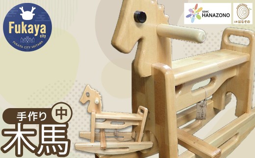 「工房はなぞの」という障害のある方が通う作業場で、職員が1品ごとに設計図を描き、利用者様と長い時間をかけて制作をした木馬です。