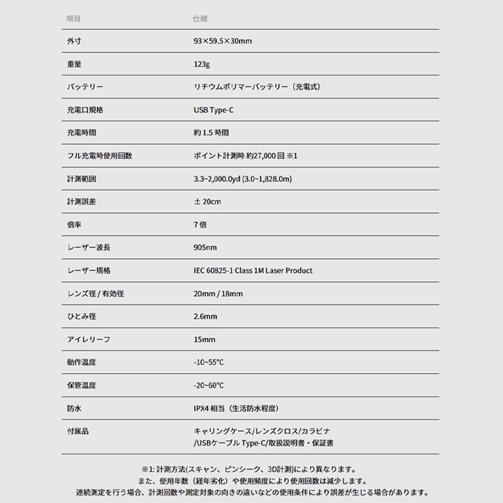 | 容量 | Shot Navi PRECIS 1台 ★カラーは<ブラック・ホワイト>の2色から選べます。 【本体仕様】 サイズ:93×59.5×30mm 重量:123g バッテリー:リチウムポリマー(充電式) 充電時間:約1.5時間 フル充電時使用回数:ポイント計測時 約27,000 回 レーザー規格:IEC60825 1 Class 1M Laser Product 測定誤差:±20cm 測定範囲:3.3~2,000.0y(3.0~1,828.0m) レンズ径:20mm/18mm ひとみ径:2.6mm アイレリーフ:15mm 倍率:7倍 防水:IP4(生活防水程度) 付属品:キャリングケース、レンズクロス、カラビナ、USB ケーブルType-C、取扱説明書兼保証書 |