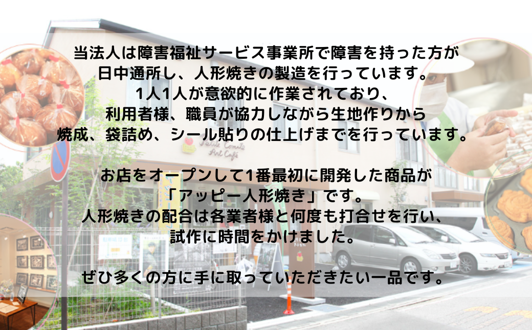 数ある返礼品の中からアッピ―人形焼きを選択していただくのはとてもうれしく思います。ふるさと納税の返礼品でアッピ―人形焼きを使用していただくことで、事業所の利用者様の仕事ができ、いきいきと働くことができるきっかけとなっております。