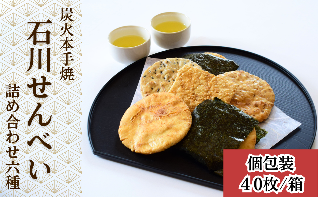 全て手作業の炭火本手焼にこだわる真心の煎餅店です。 炭火本手焼 炭火本手焼「石川せんべい」詰め合わせ6種類の計40枚入り | 埼玉県 上尾市 煎餅 せんべい 炭火 和菓子 お菓子 お茶に合う お茶請け 手焼きせんべい 昔ながら 手焼き しょうゆ味 醤油せんべい 箱入り 手土産 美味しい おいしい おやつ お菓子 米 ギフト 贈答 お土産 老舗 プレゼント 配る お茶菓子 おやつ しょうゆ 海苔 わさび海苔 黒ごま 白ごま つぶ 醤油