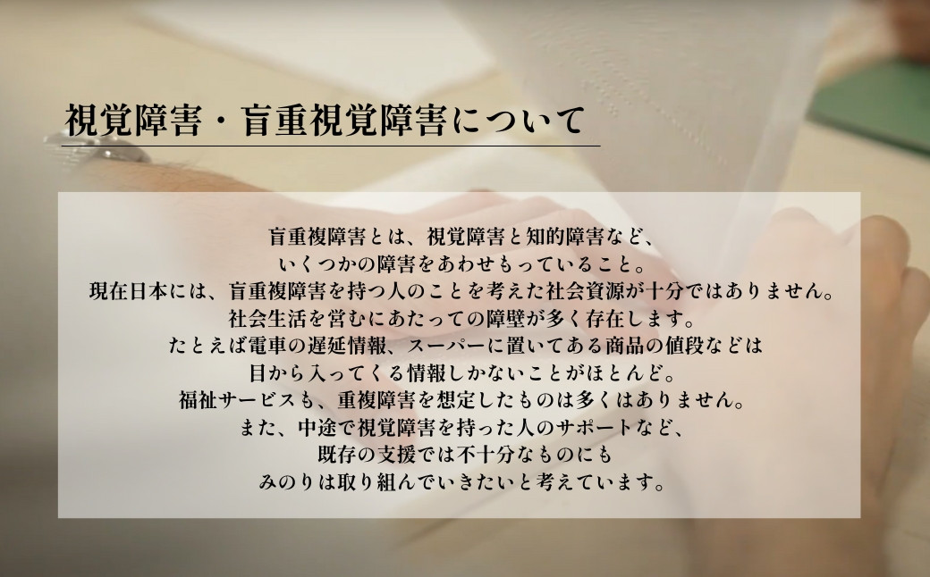 「盲学校卒業後の子どもたちの生活が、”みのり”あるものになることを願って」、そんな想いで、2013年5月、盲学校の保護者達によってつくられたみのり。視覚障害や、複数の障害を併せ持つ盲重複障害に対する理解を深めてもらうための啓発活動を行っています。そして、障害福祉サービス事業所「領家グリーンゲイブルズ」の設立にむけての活動が実を結び、2020年4月、開設いたしました!