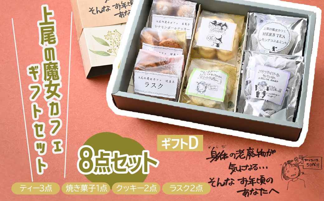| 容量 | 【魔女カフェギフトD】 体の老廃物が気になる そんな年頃のあなたへ <魔女カフェオリジナルブレンドハーブティー> ・カモミール&ネトル ・レモングラス&ミント ・バタフライピー&ラベンダー <焼き菓子> ・シナモンボール <クッキー> ・ネトルクッキー ・プレーンクッキー <ラスク> ・プレーンラスク ・ジンジャーラスク |