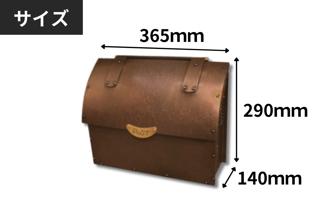 | 容量 | ポスト2型 1基 寸法:H290×W365×D140mm 重さ:4.8kg 素材:銅(本体)+真鍮(取手) 仕様:アラシ 上ぶた開閉による出し入れ 仕上:イブシ |